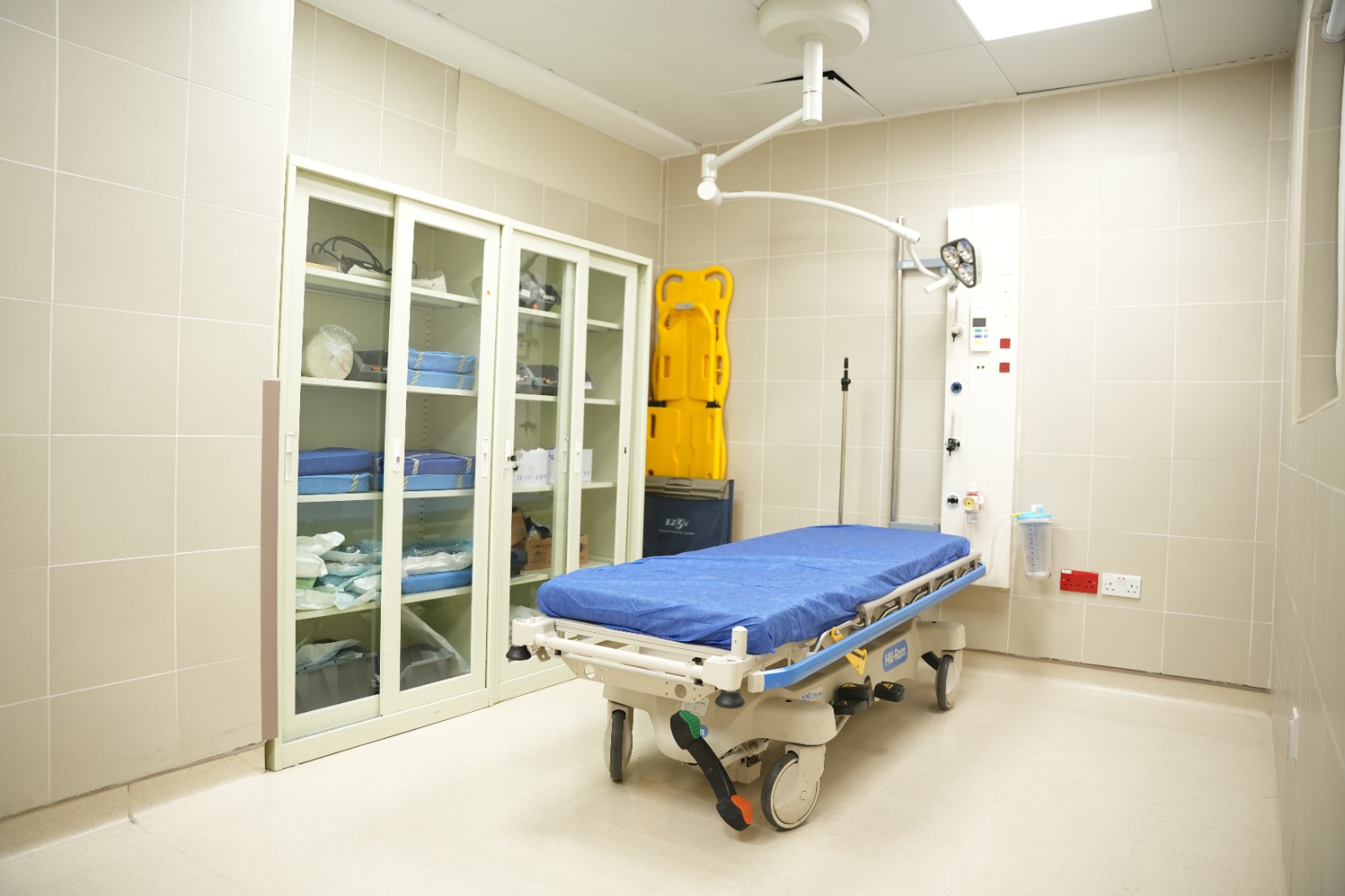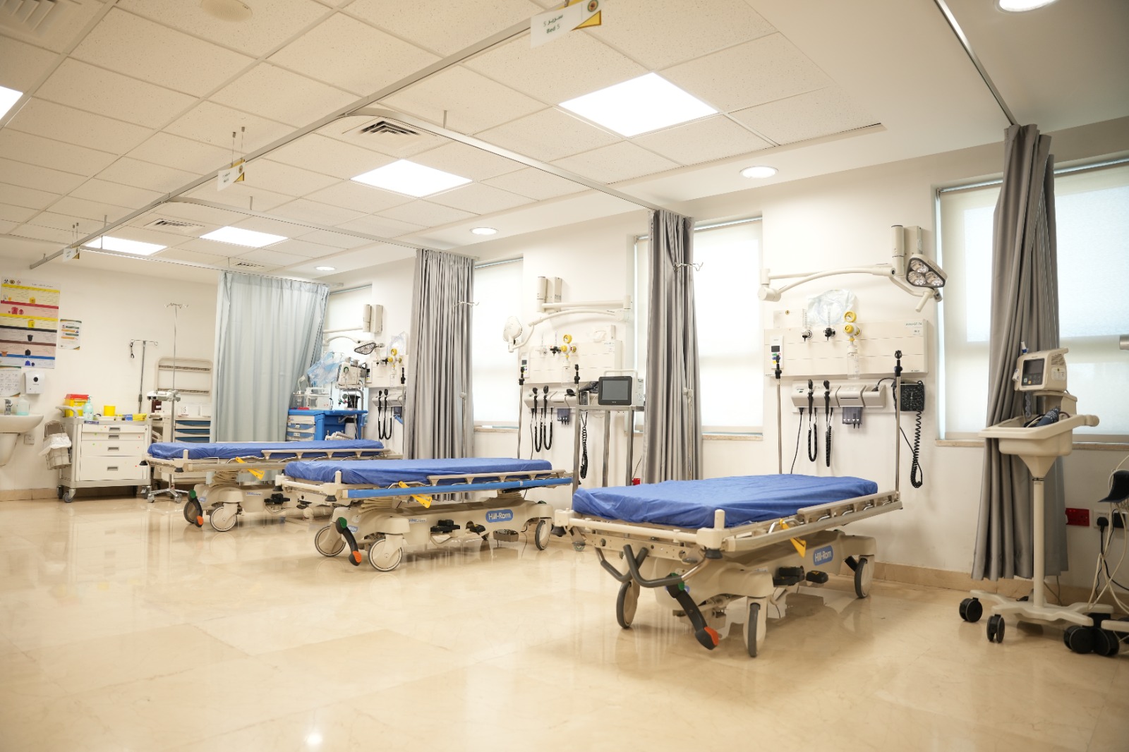 وتم إنشاء قسم الاسعاف والطوارئ وتجهيزه بجميع الأجهزة والأدوات والمعدات التي تمكن كافة الكوادر العاملة في القسم بإستقبال جميع حالات الحوادث والإصابات بالإضافة إلى جميع الحالات الطبية الإسعافية العاجلة في جميع التخصصات كتخطيط القلب والإنعاش القلبي والرئوي ، إضافة إلى وجود غرف خاصة مجهزة كغرفة تصنيف الحالات المرضية ، وغرفة العمليات الصغرى بإشراف إختصاصيي جراحة لعلاج الحالات التي تتطلب تخدير موضعي بأحدث المعدات والأدوات الطبية، وغرفة الجبائر والجبس لعلاج حوادث السقوط والحالات التي تحتاج تدخل إختصاصي العظام مع توفر جميع أنواع الجبائر والجبس حسب حاجة المريض والطبيب، وجناح طوارئ الأطفال والمجهز بكافة المعدات اللازمة بإشراف إختصاصيين في طب الأطفال من عمر حديثي الولادة وحتى 12 سنة، وطوارئ النسائية التابعة لقسم النسائية وذلك لضمان خصوصية المريضة وراحتها، وغرف إنتظار واسعة للمرضى والتي تراعي معايير الوقاية والتباعد، وغرف طوارئ الأسنان وأسنان الأطفال لجميع الحالات الطارئة وغير الطارئة، وغرف العزل المنفصلة عن باقي الغرف والتي تعمل ضمن معايير ضبط العدوى والوقاية الشخصية .