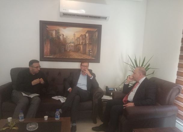 عمون - التقى المهندس رفيق خرفان مدير عام دائرة الشؤون الفلسطينية في مكتبه الأحد مدير عمليات الأونروا اولاف بيكر بحضور مديرة مديرية الأونروا والمنظمات الدولية هبة المعاني.