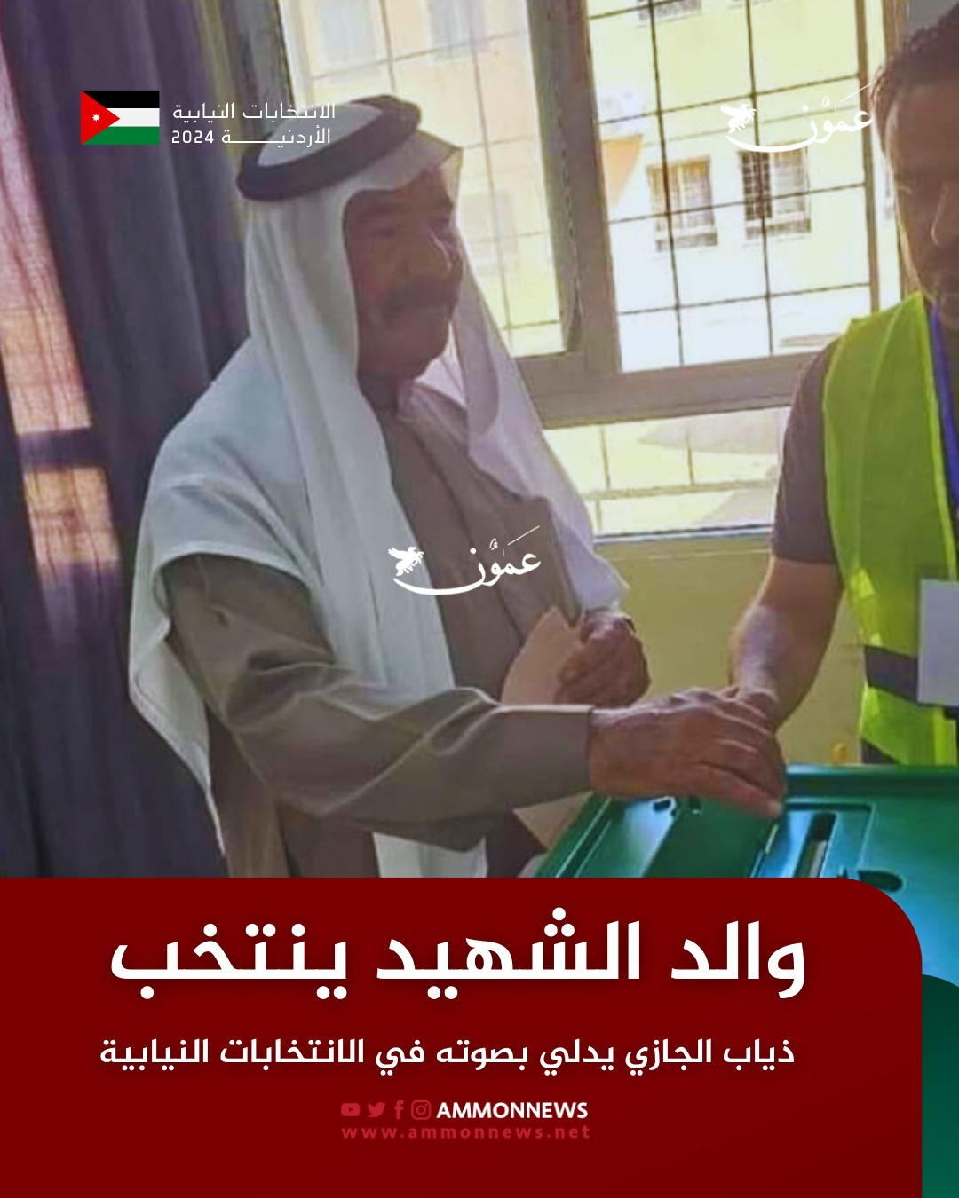 عمون - رغم توافد المعزين من كافة أرجاء الوطن، أصر والد الشهيد ماهر ذياب الجازي على الإدلاء بصوته والمشاركة في الاقتراع بالانتخابات النيابية 2024. |