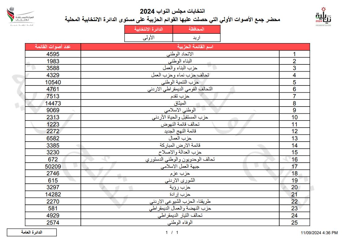 عمون - تنشر وكالة عمون الاخبارية تباعا محاضر النتائج الأولية للأحزاب في الدائرة العامة، على مستوى الدوائر الانتخابية بحسب جاهزيتها اولا باول.