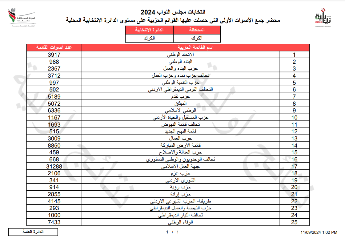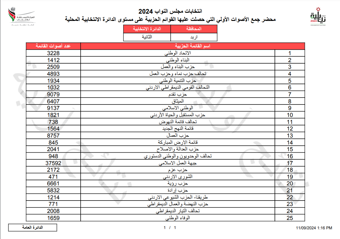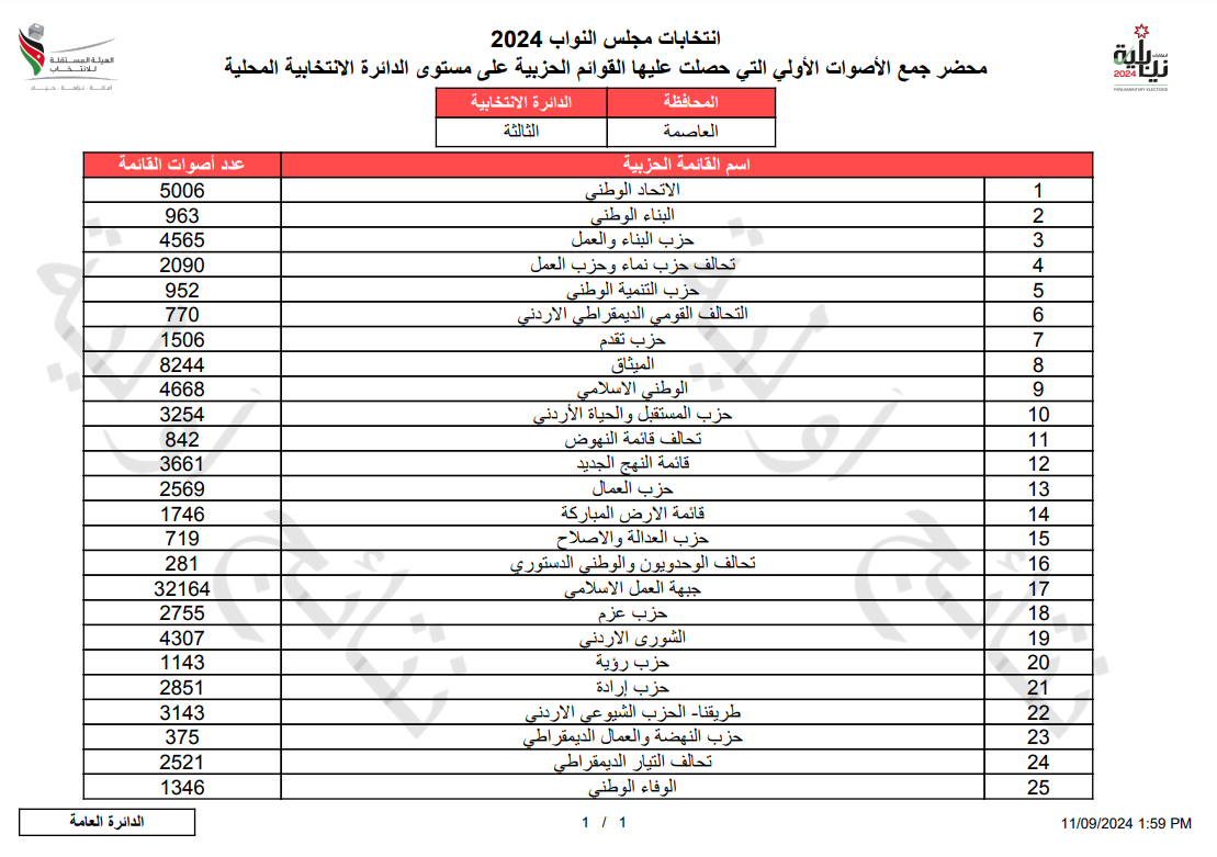 عمون تنشر محاضر نتائج الأحزاب في الدائرة العامة