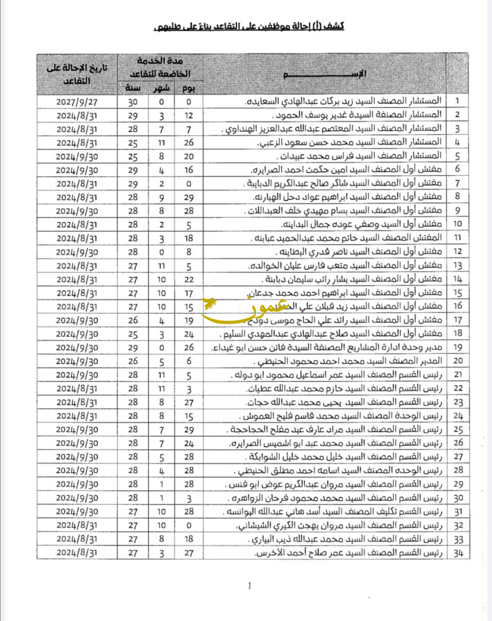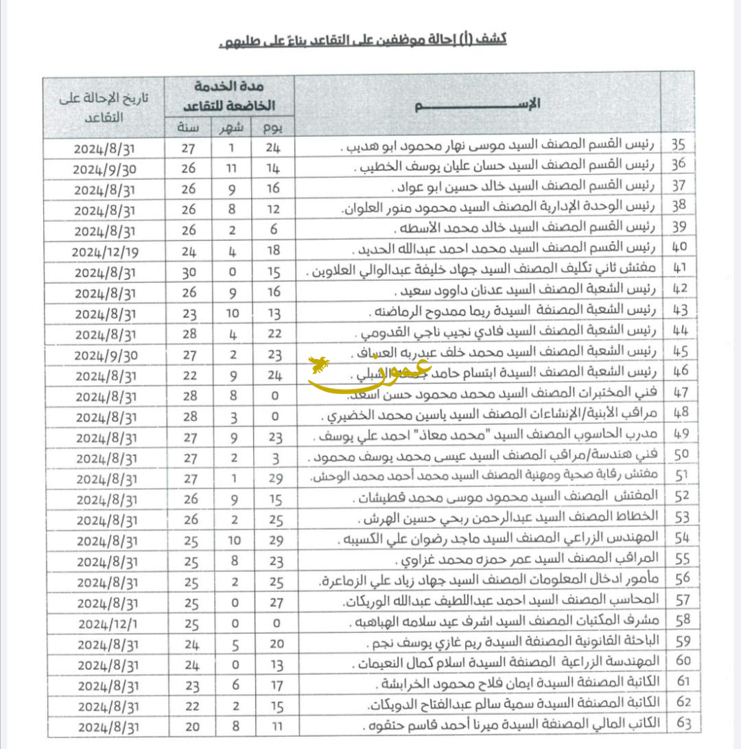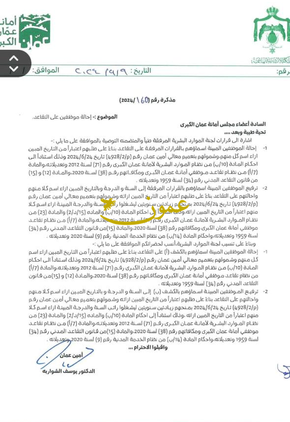 عمون - قرر أمين عمان الدكتور يوسف الشواربة التنسيب بإحالة مستشارين ورؤساء أقسام وموظفين المبينة أسماؤهم أدناه الى التقاعد بناء على طلبهم اعتبارا من التاريخ المبين زاء كل اسم منهم، وشمولهم باحكام المادة 10/ب من نظام الموارد البشرية لامانة عمان الكبرى رقم 71 لسنة 2024وتعديلاته والمادة 7/أ من نظام تقاعد موظفي الامانة ومكآفآتهم رقم 38 لسنة 2020 والمادة 12 و 15 من قانون التقاعد المدني رقم 34 لسنة 1959 وتعديلاته . |