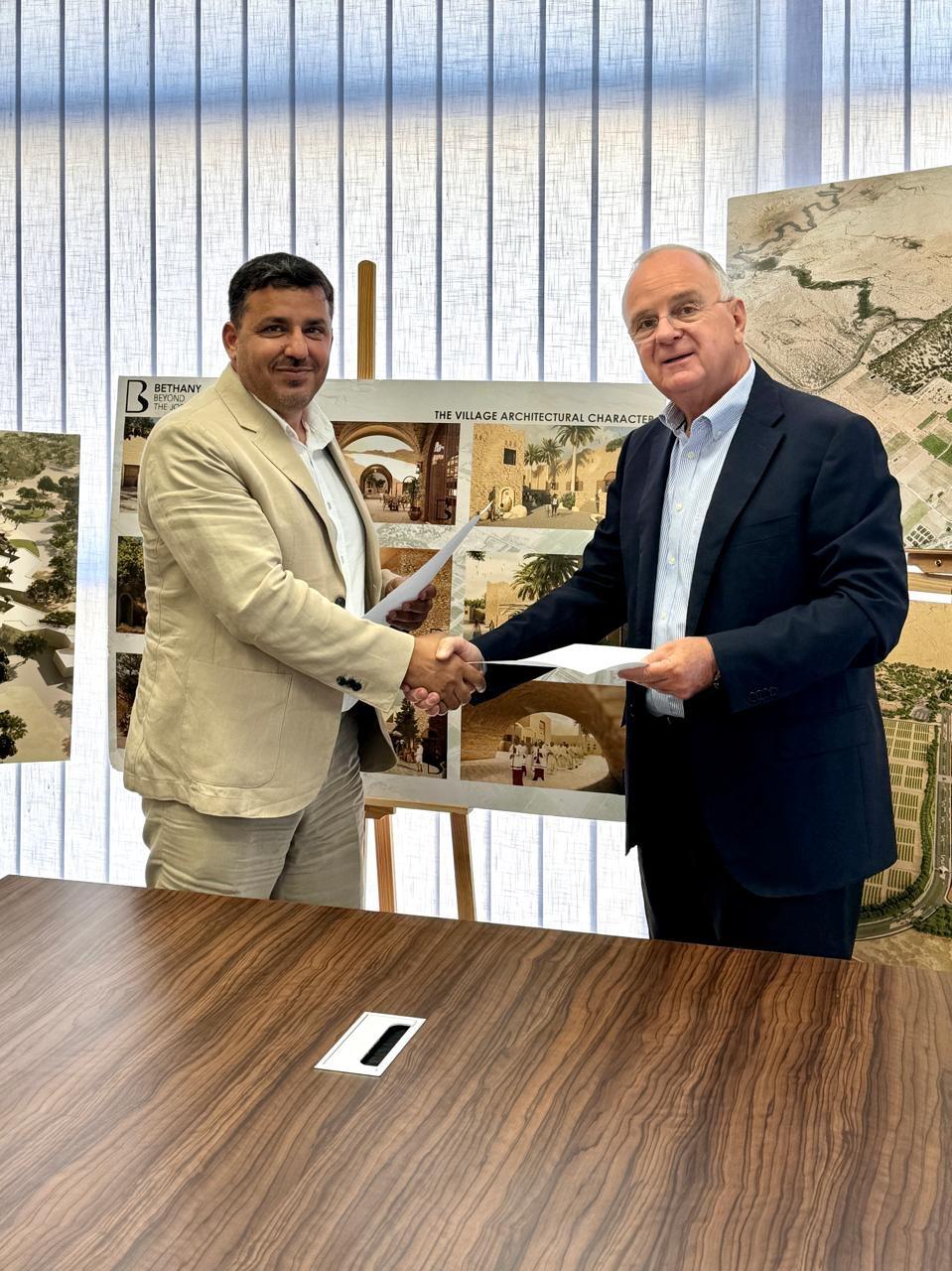 وقام بتوقيع الاتفاقية رئيس مجلس أمناء المؤسسة سمير مراد وبركات النوافلة، حيث أشار مراد إلى أن الاتفاقية هي الثانية التي توقعها المؤسسة خلال هذا العام وذلك تنفيذا للمخطط الهيكلي الشامل للمنطقة التي تشمل 1374 دونما قرب موقع عماد المسيح، الإرث الديني والتاريخي المدرج على قائمة اليونسكو للتراث العالمي.