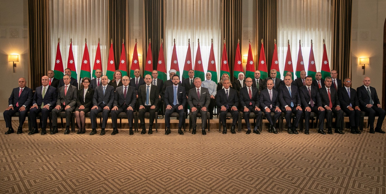 وأدى رئيس الوزراء والوزراء اليمين الدستورية أمام جلالة الملك، في قصر الحسينية، بحضور سمو الأمير الحسين بن عبدالله الثاني، ولي العهد، وسمو الأمير مرعد بن رعد، كبير الأمناء في الديوان الملكي الهاشمي، ورئيس الديوان الملكي الهاشمي يوسف حسن العيسوي.