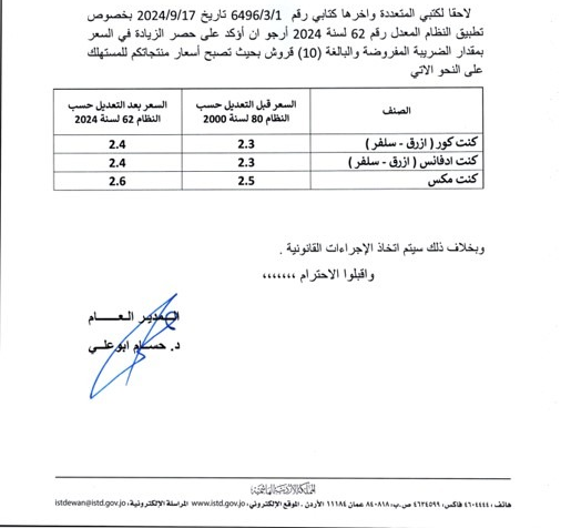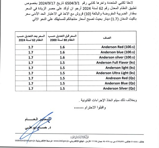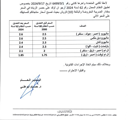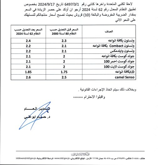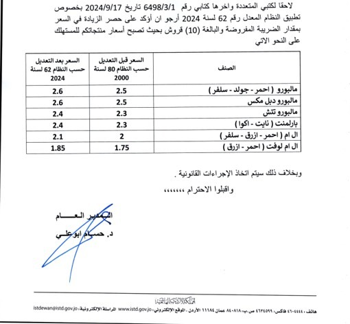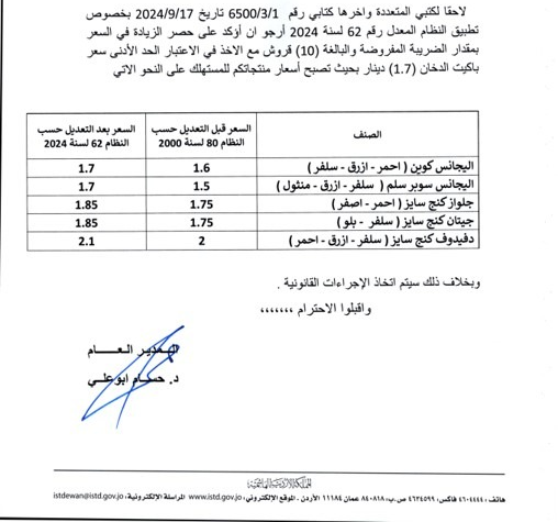 عمون - وجه مدير عام دائرة ضريبة الدخل والمبيعات حسام أبو علي، الخميس، كتب رسمية لجميع شركات السجائر في المملكة وطلب فيها من هذه الشركات ضرورة التقيد والالتزام بأسعار أنواع السجائر التي تنتجها هذه الشركات وتم ارفاق أسماء وأنواع هذه المنتجات واسعارها قبل التعديل والاسعار المقرر الالتزام بها بعد التعديل . |