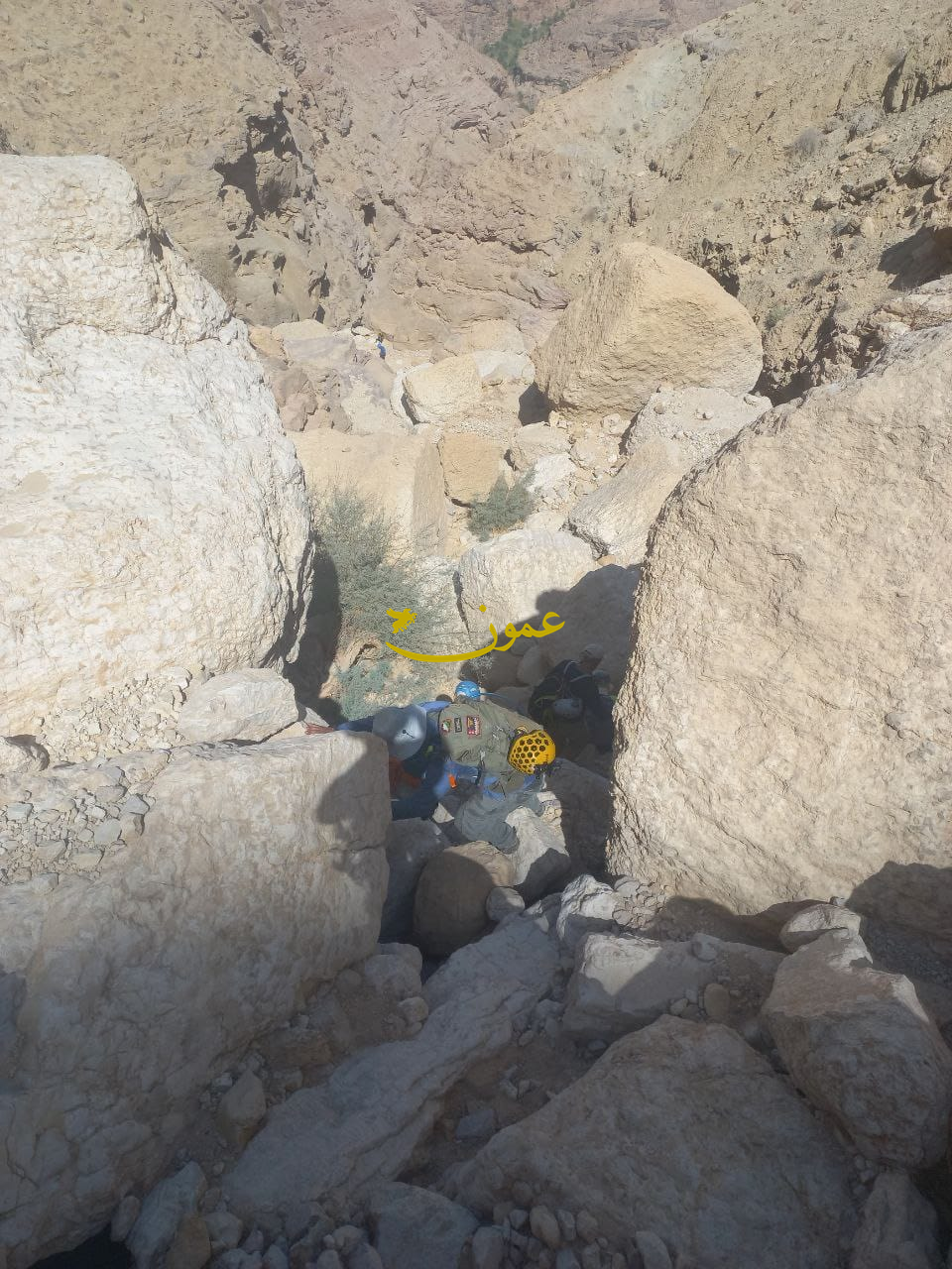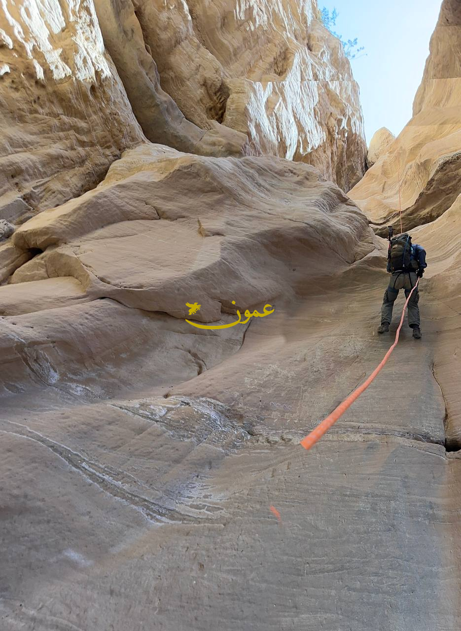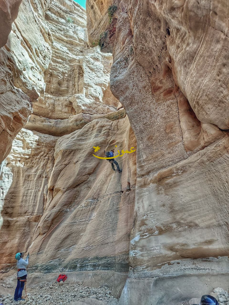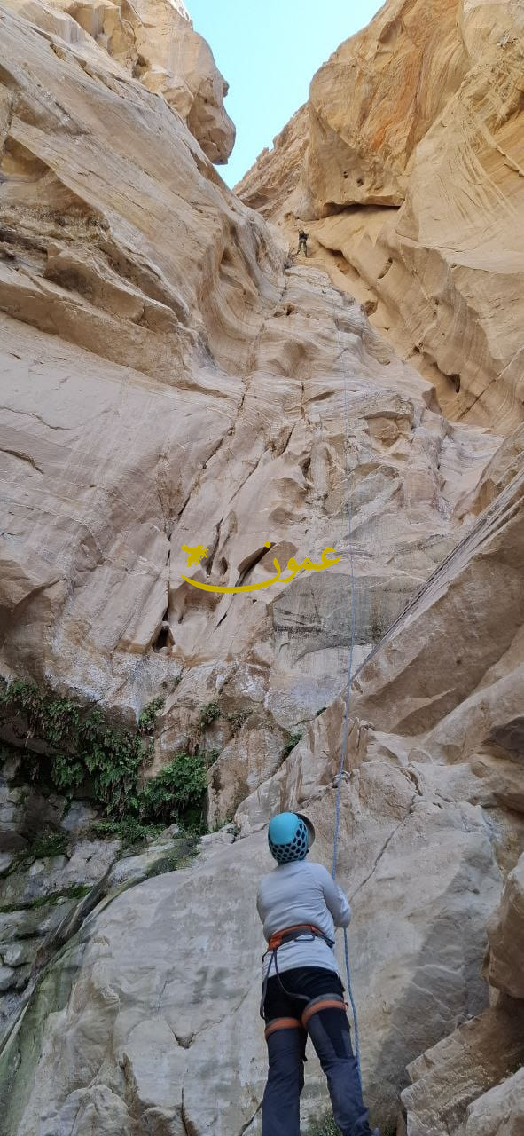 بعد الإنزال الأول البالغ 15 متر فوق جلاميد بيضاء، والثاني البالغ 10 متر والذي احتاج ببدايته لقدر من الحذر واللذان شكّلا لنا نوعا من التأهيل والإعداد النفسي لما بعدهما والبالغ 25 مترا،كنا وصلنا لقلب الجبل حيث الإنزال الأكثر إثارة والبالغ 60 مترا الذي يحتاج في البداية للمسير على الحافة مع ربط حلقة الأمان بشكل منزلق عبر حبل حديدي ثُبت باحترافية بالصخور بمبادرة ذاتية من عشاق المغامرة وصولا لنقطة البداية التي نقف عليها مع القائد، حيث ترى الفضاء الفسيح ليخلق لك فارقا بالشعور مابين الإنزال الفعلي وارتفاع المدى المغطى بأشجار النخيل البري المتواري بين شواهق تلامس عنان السماء تعددت ألوانها وغلب عليها درجات الكرميدي والأصفر.