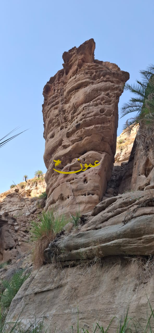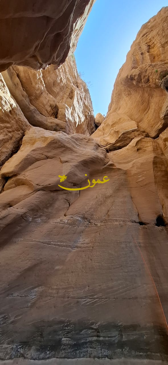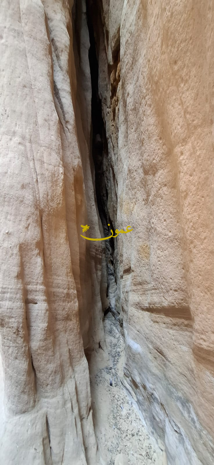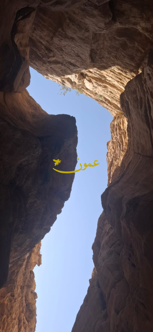 بعد الإنزال الأول البالغ 15 متر فوق جلاميد بيضاء، والثاني البالغ 10 متر والذي احتاج ببدايته لقدر من الحذر واللذان شكّلا لنا نوعا من التأهيل والإعداد النفسي لما بعدهما والبالغ 25 مترا،كنا وصلنا لقلب الجبل حيث الإنزال الأكثر إثارة والبالغ 60 مترا الذي يحتاج في البداية للمسير على الحافة مع ربط حلقة الأمان بشكل منزلق عبر حبل حديدي ثُبت باحترافية بالصخور بمبادرة ذاتية من عشاق المغامرة وصولا لنقطة البداية التي نقف عليها مع القائد، حيث ترى الفضاء الفسيح ليخلق لك فارقا بالشعور مابين الإنزال الفعلي وارتفاع المدى المغطى بأشجار النخيل البري المتواري بين شواهق تلامس عنان السماء تعددت ألوانها وغلب عليها درجات الكرميدي والأصفر.