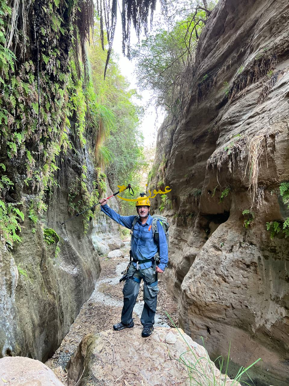 وبعد ثلاثة كيلومترات وصلنا فم الوادي لنتجهز بأدوات الإنزال الجبلي من ارتداء الخوذ والحزام الحامل حيث يقوم قائد المسار بالتأكد من ارتدائه بالشكل الصحيح، ومدى صلاحية حلاقات التعلق والمرابط معيدا ومكررا تعليمات السلامة وشروط الإنزال السليم بعدم الإقتراب من الحواف بشكل قاطع وترك مسافة أمان بما لا يقل عن ثلاثة أمتار، واليوم تولى ذلك محمود الكردي وزوجتة كفاية الحسيني وهم من أصحاب الخبرة والتفاهم العالي ما بين قائد محطتي الإنزال وقاعدة الوصول.
