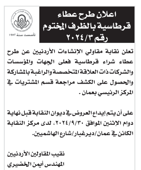 عطاء شراء قرطاسية لنقابة مقاولي الانشاءات الاردنيين