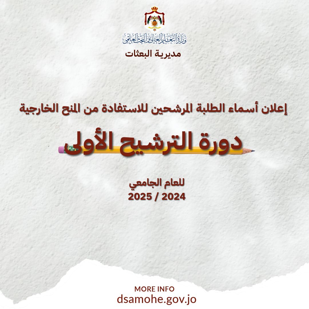 عمون - أعلنت مديرية البعثات في وزارة التعليم العالي والبحث العلمي اليوم السبت، أسماء الطلبة المرشحين للاستفادة من المنح الخارجية للعام الجامعي 2024-2025 ضمن دورة الترشيح الأولى، وذلك من خلال الموقع الإلكتروني لمديرية البعثات على الرابط التالي www.dsamohe.gov.jo .