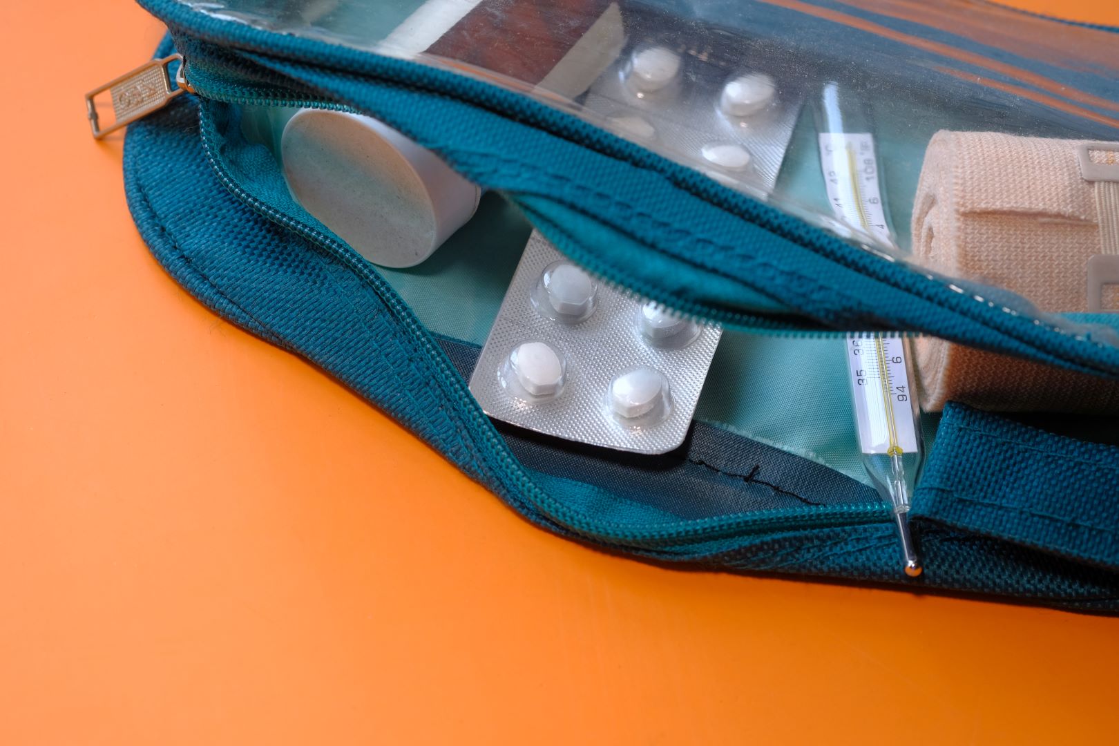 ميزان حرارة وأقراص وعبوة فقاعية في حقيبة أدوية
