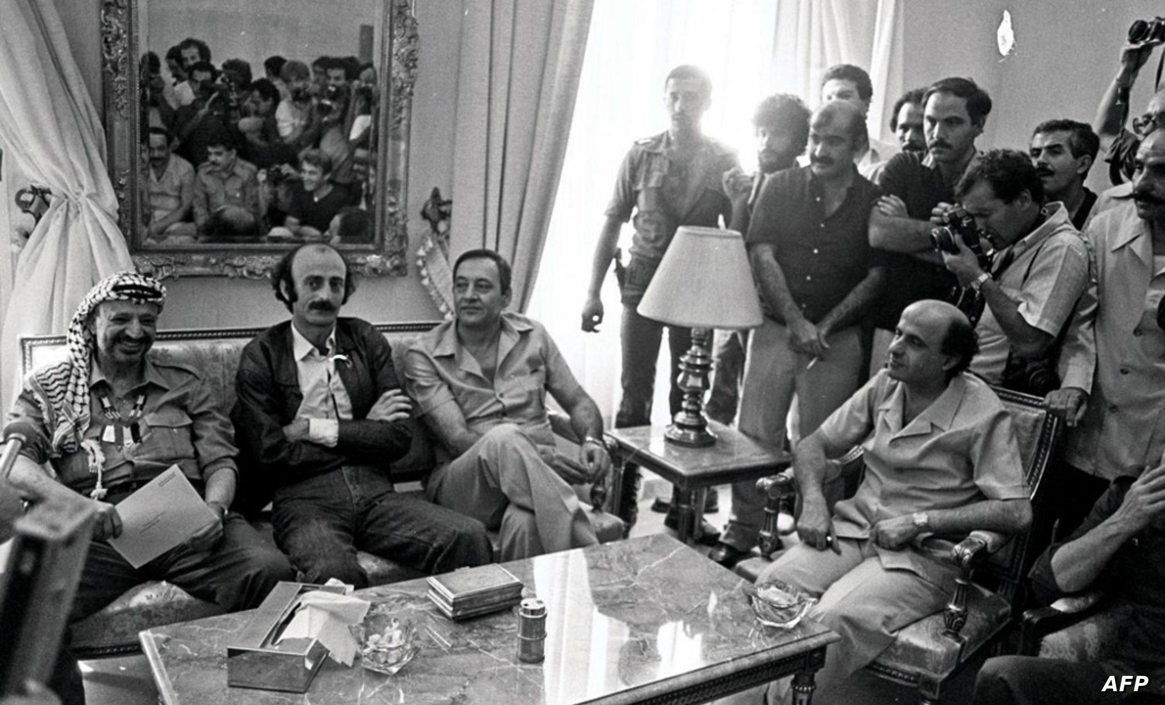 عمون - الصورة بالأبيض والأسود. مؤرخة في 30 أغسطس 1982. يبدو فيها نبيه بري، زعيم حركة "أمل"، إلى جانب وليد جنبلاط، زعيم الحزب التقدمي الإشتراكي وهما يودّعان ياسر عرفات، رئيس منظمة التحرير الفلسطينية قبل مغادرته بيروت مع المسلّحين الفلسطينيين إلى تونس، كتسوية تنهي حصار الجيش الإسرائيلي للعاصمة اللبنانية.