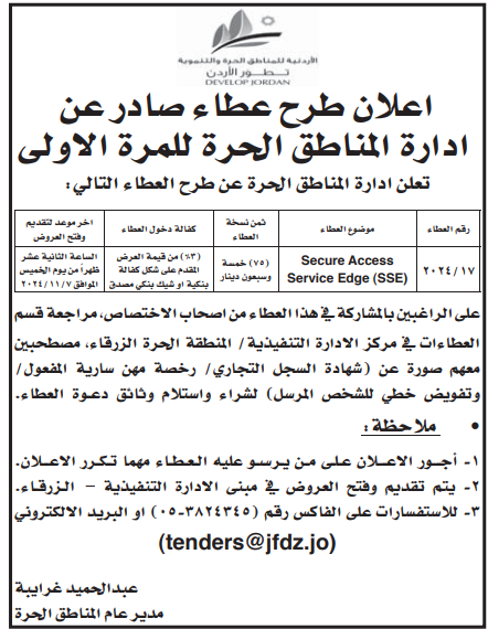 عطاء صادر عن ادارة المناطق الحرة
