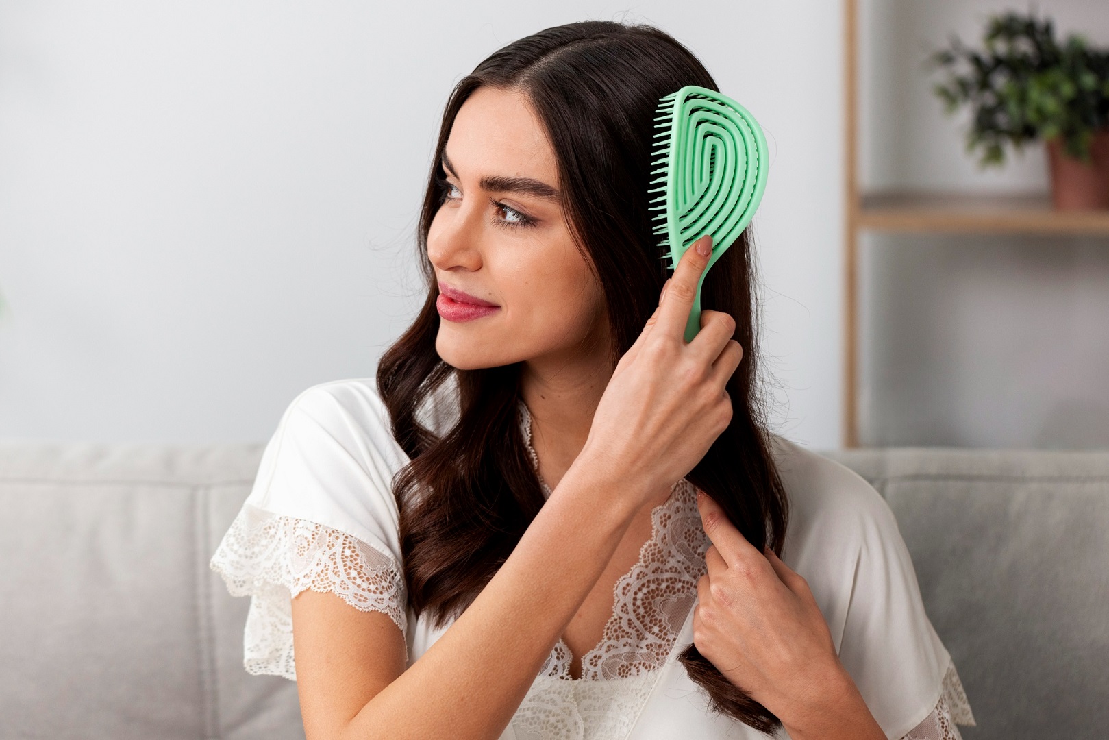 امرأة تسرح شعرها بسهولة بعد استعمال ماسك النشا