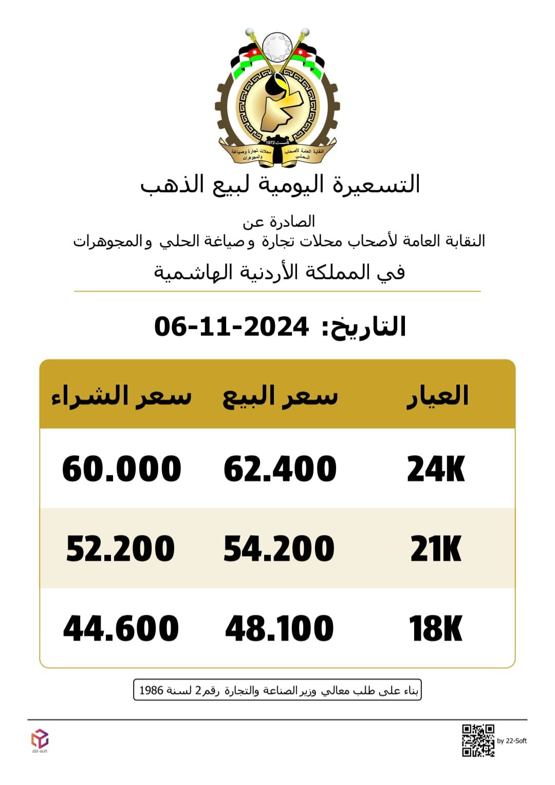 عمون - انخفضت أسعار الذهب في الأسواق المحلية، اليوم الأربعاء، 1.30 قرشا للغرام، بحسب التسعيرة الثالثة الصادرة عن النقابة العامة لأصحاب محال تجارة وصياغة الحلي والمجوهرات. |