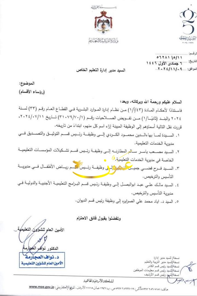 عمون - ينال المعاني - قرر امين عام وزارة التربية والتعليم الدكتور نواف العجارمة إجراء تشكيلات إدارية في ادارة التعليم الخاص.