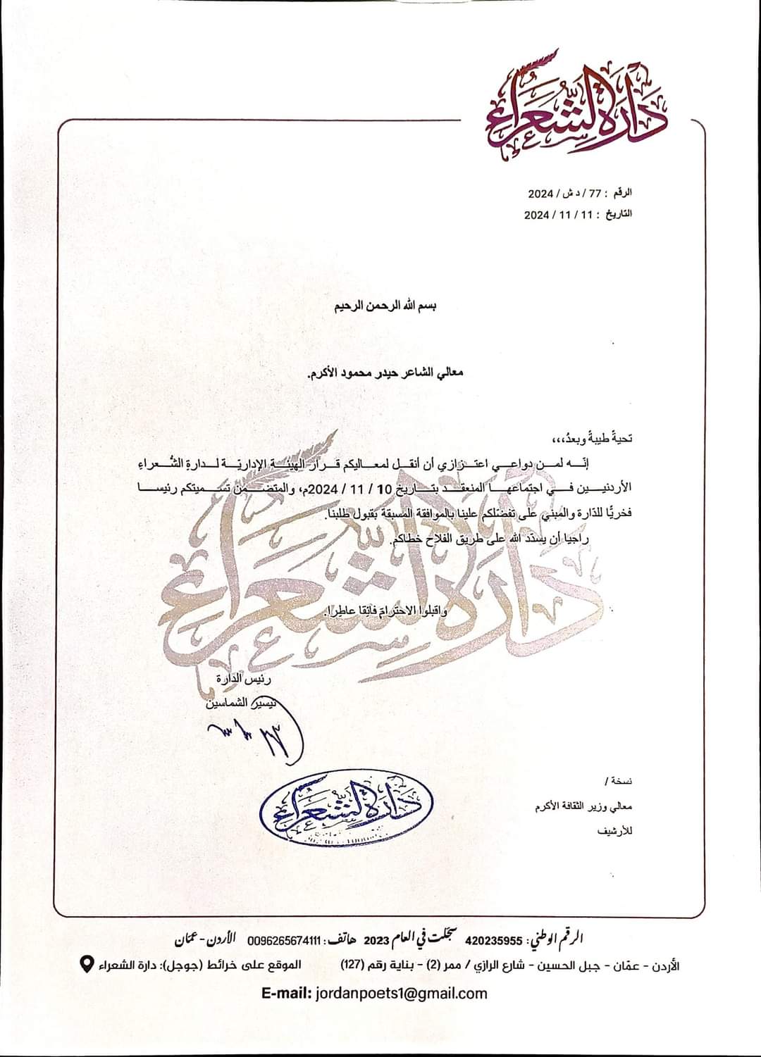 عمون- قررت الهيئة الإدارية لدارة الشعراء الأردنيين، خلال اجتماعها المنعقد يوم 10 .11. 2024، تسمية الشاعر الأردني الكبير حيدر محمود رئيساً فخرياً للدارة. ويأتي هذا القرار تتويجاً لموافقة الشاعر حيدر محمود على طلب الهيئة بتقلد هذا المنصب، تقديراً لإسهاماته الأدبية وإثرائه للمشهد الشعري والثقافي في الأردن والوطن العربي. |