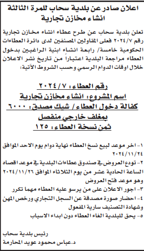 عطاء انشاء مخازن تجارية لبلدية سحاب