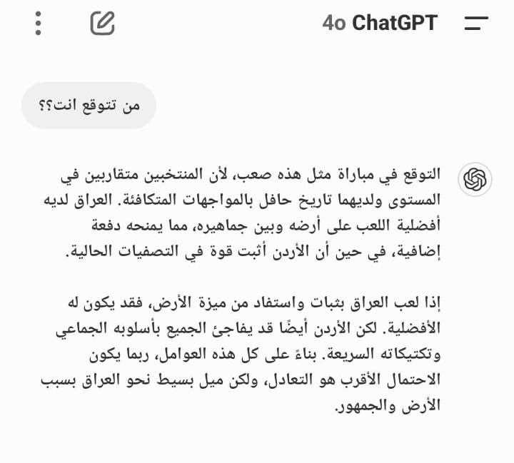 فريق عمون قام بتجربة من خلال توجيه عدة أسئلة لـ "GPT" أحد وسائل نظام الذكاء الاصطناعي حول توقعاته لمباراة الأردن والعراق حيث اجاب: " أن التوقع في مباراة مثل هذه صعب، لأن المنتخبين متقاربين في المستوى ولديهما تاريخ حافل بالمواجهات المتكافئة، الا ان العراق لديه أفضلية اللعب على أرضه وبين جماهيره، مما يمنحه دفعة إضافية، في حين أن الأردن أثبت قوة في التصفيات الحالية".