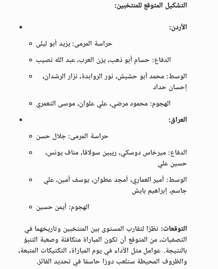 وبخصوص التشكيلة المرتقبة للمبارة وحالة المنتخبين وحظوظهما ضمن المجموعة، أفاد الـ "GPT" بأن الأردن يحتل المركز الثاني في المجموعة الثانية برصيد 7 نقاط متساوٍ مع العراق، لكنه يتفوق بفارق الأهداف، بينما يأتي العراق في المركز الثالث بنفس الرصيد من النقاط، خلف كوريا الجنوبية المتصدر بـ 10، فيما حلت عُمان والكويت رابعا وخامسا بـ 3، وفلسطين أخيرا بنقطتين.