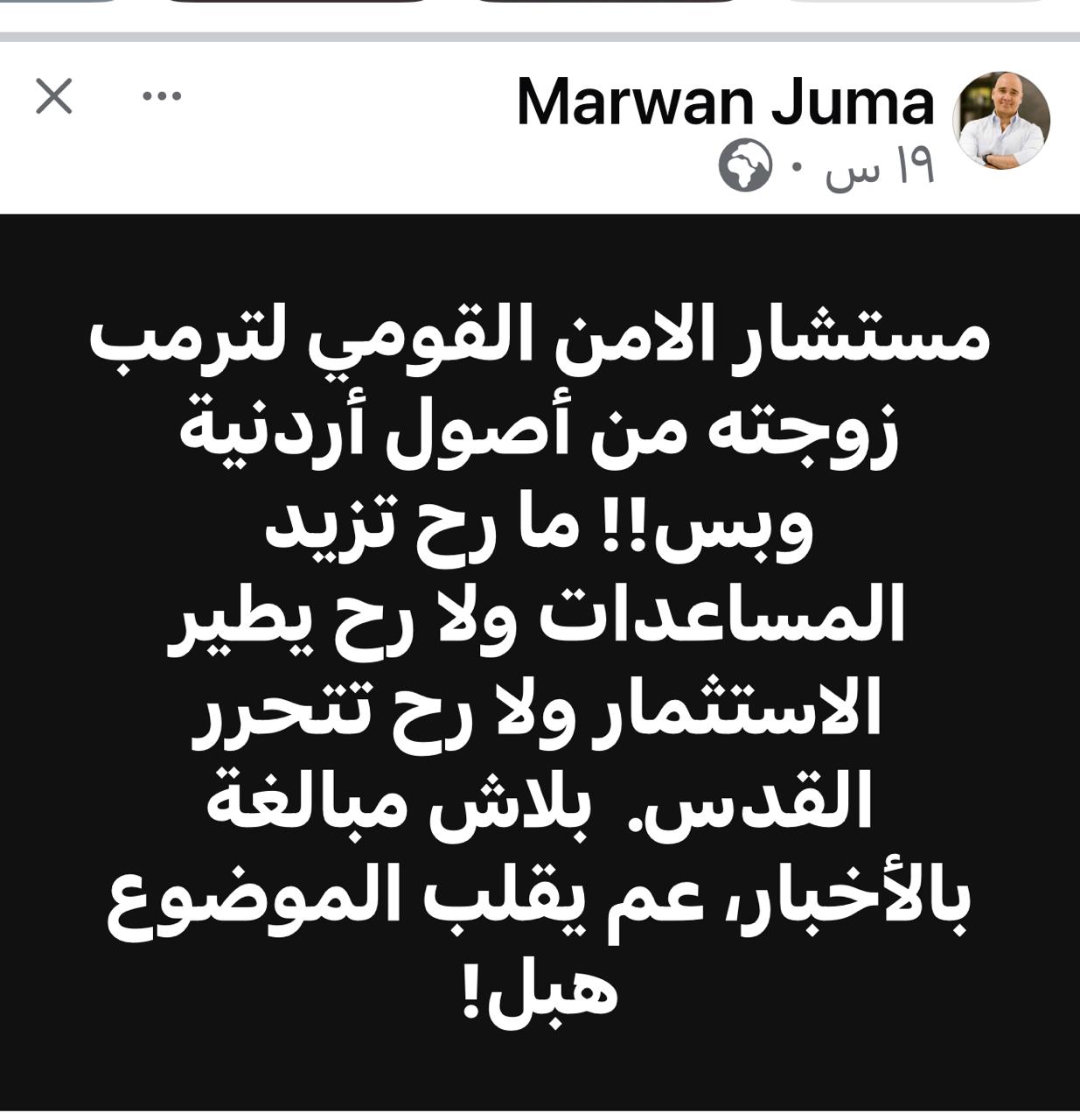 عمون - انتقد الوزير الاسبق مروان جمعة، كثرة ما ينشر حول الأميركية من أصل أردني جوليا نشيوات، وتردد اسمها في التغطيات السياسية الأميركية المرتبطة بالترتيبات الإدارية التي يستحدثها الرئيس المنتخب دونالد ترامب قبل دخوله الرسمي للبيت الأبيض في نهاية يناير القادم. |