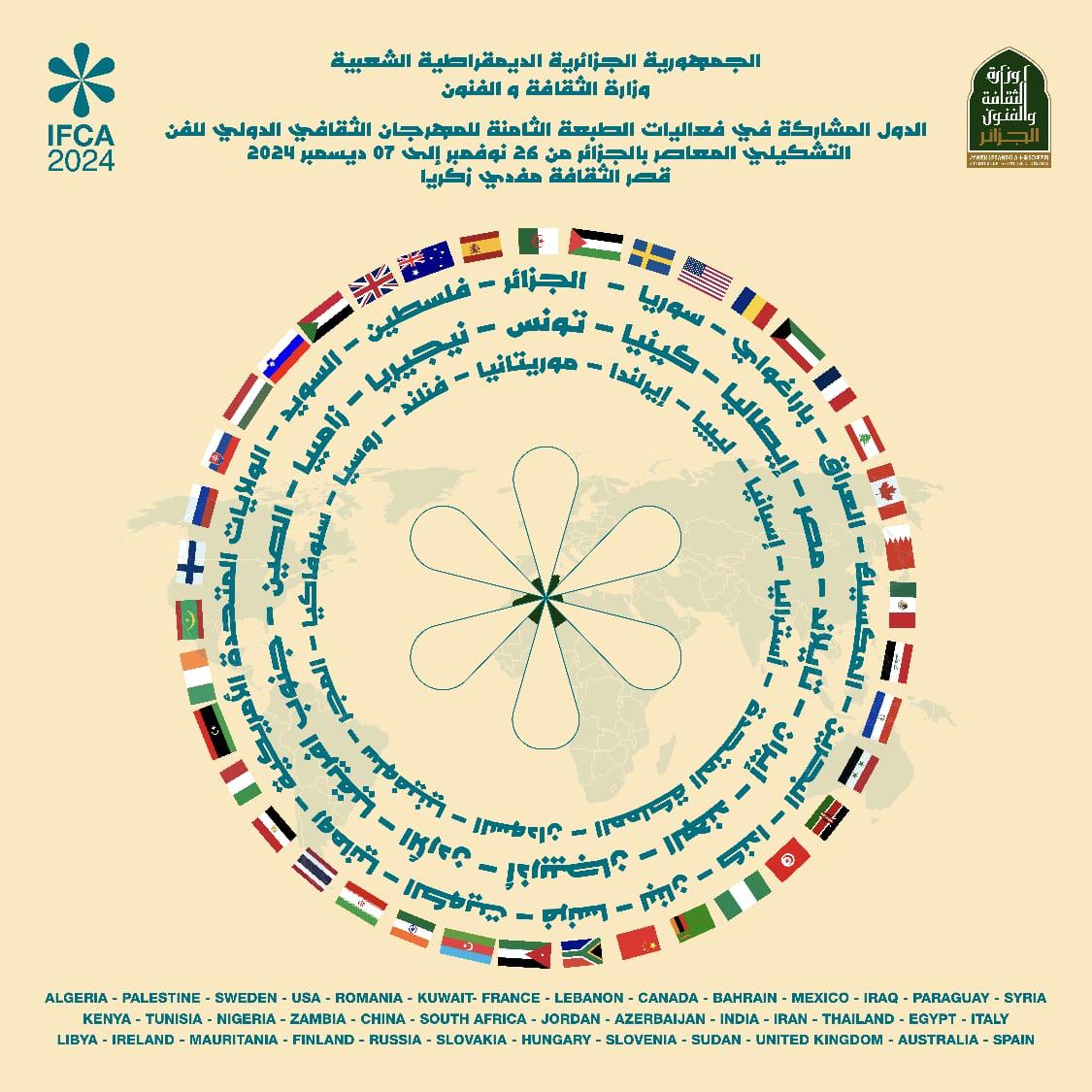 عمون - بمشاركة أكثر من 39 دولة وفلسطين ضيف شرف تحتضن العاصمة الجزائرية من 26 نوفمبر الى غاية 7 ديسمبر المقبل، الطبعة الثامنة من المهرجان الثقافي الدولي للفن التشكيلي المعاصر، بمشاركة 39 دولة من القارات الخمس، و حضور 70 ضيفا من مختلف دول العالم المشاركة، حيث اختيرت فلسطين ضيف شرف هذه الطبعة.