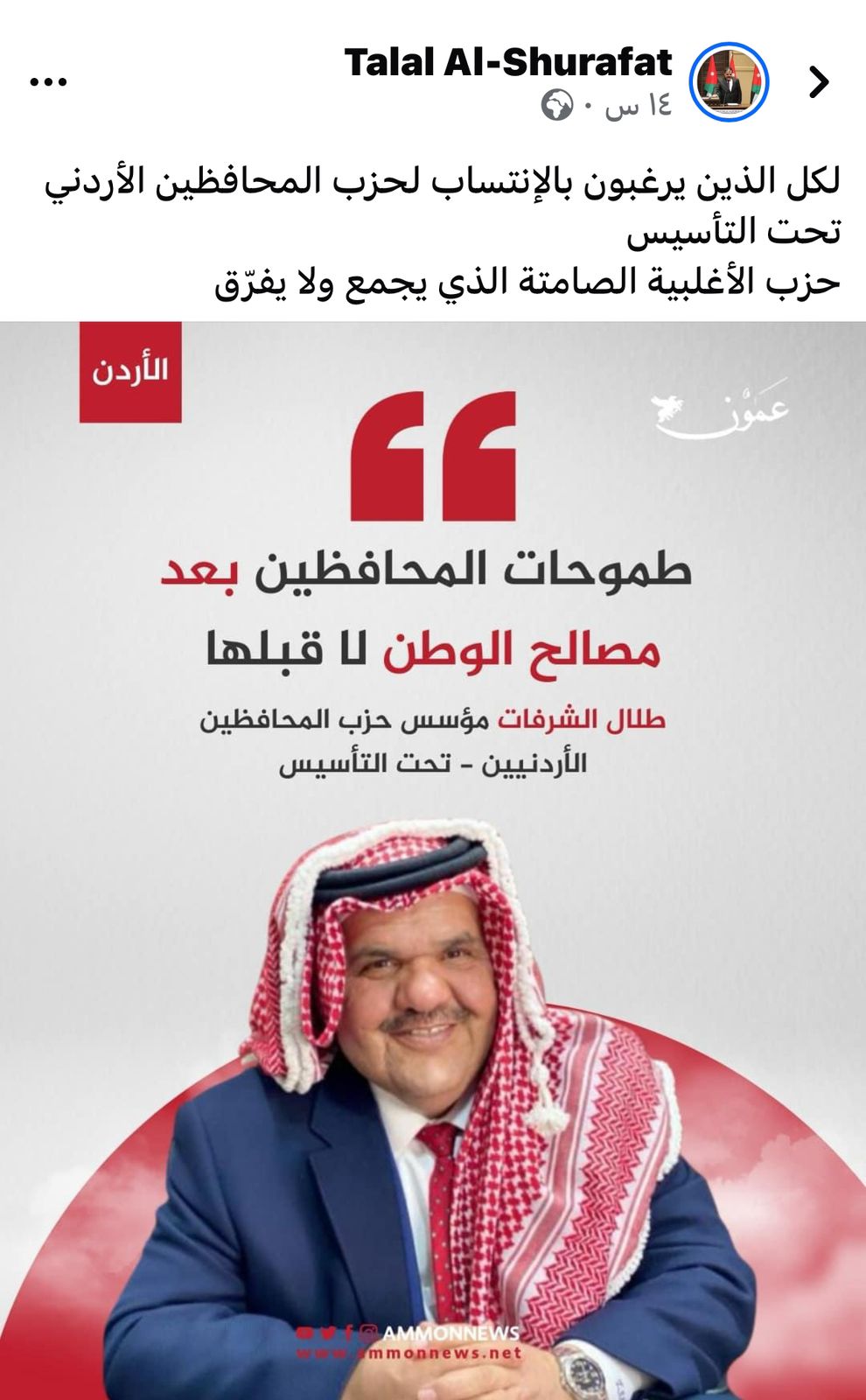 عمون - علق الوزير الأسبق نوفان العجارمة على منشور للدكتور طلال الشرفات، يتحدث عن طموحات حزب المحافظين والذي يسعى الشرفات لتأسيسه، قائلا: |