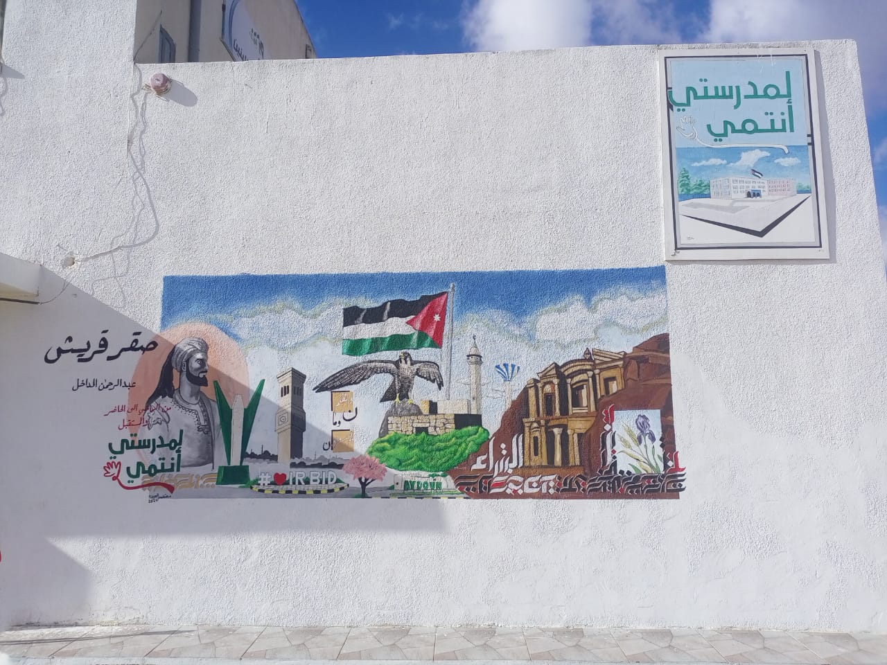 ونفذت الجدارية الفنية بريشة معلم التربية الفنية الاستاذ معتصم عيدة ، والتي تحاكي تاريخ واسم صقر قريش (عبدالرحمن الداخل) ، وتضمنت صور متنوعة من التراث الاردني والعربي، وتحدثت بمعلومات تاريخية عن منطقة ايدون.