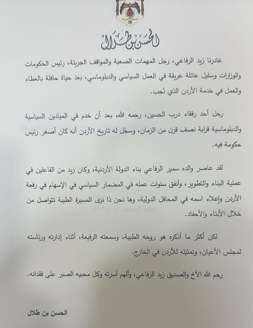 ووجه سمير الرفاعي، نجل الفقيد في كلمته شكرًا للأسرة الأردنية التي طوقت أعناق العائلة بمشاعر صادقة خففت المصاب، مؤكدًا أنّ العائلة لمست من عائلتها الأردنية دفئًا ومودة شكلت معنى الأسرة الواحدة الكبيرة.