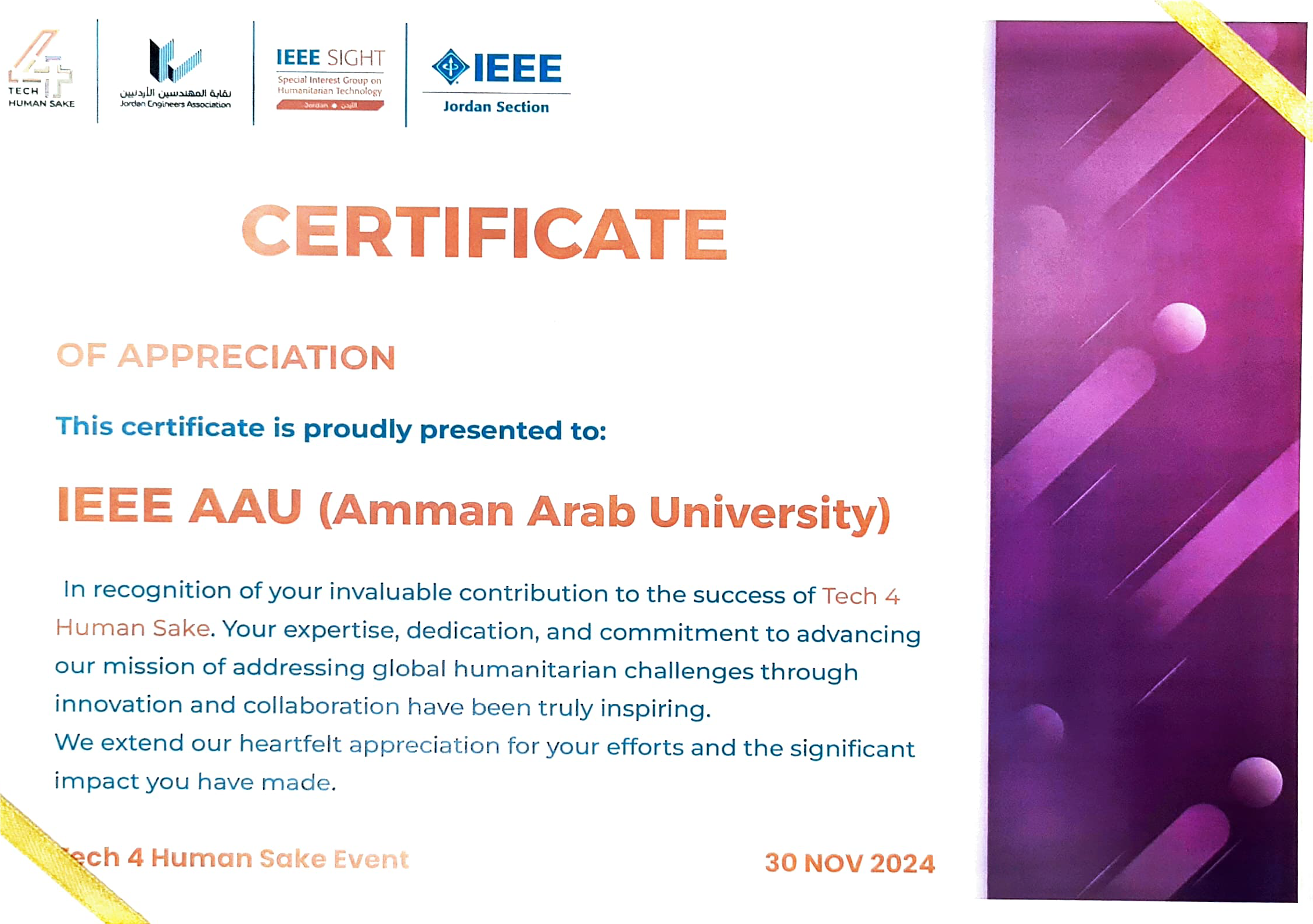جامعة عمان العربية تبرز إبداع طلبتها في فعالية Tech 4 Human Sake بدعم من IEEE ونقابة المهندسين