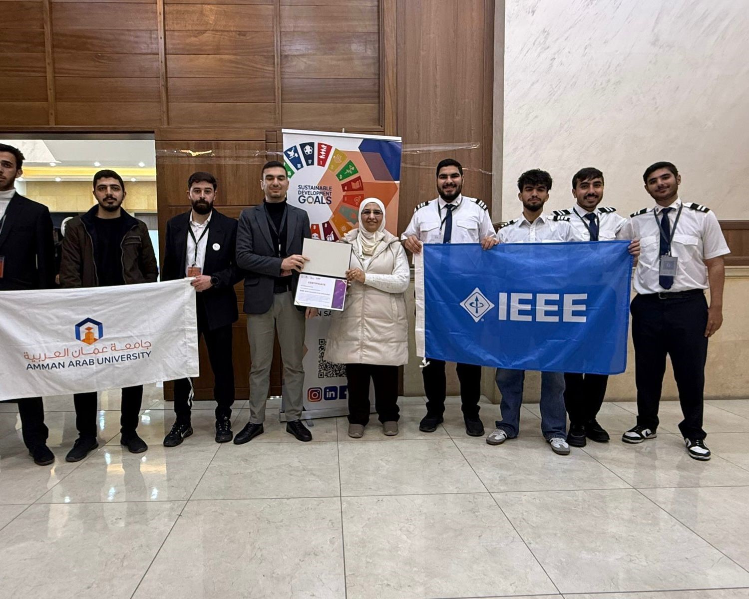 عمون - شاركت جامعة عمان العربية في فعالية Tech 4 Human Sake، الذي نظمته IEEE SIGHT (Special Interest Group on Humanitarian Technology)، بدعم من نقابة المهندسين الأردنيين و IEEE Jordan Section ، حيث شهدت الفعالية مشاركة مميزة من طلبة الفرع الطلابي لـ IEEE في جامعة عمان العربية، والذين قاموا بعرض مجموعة من المشاريع المبتكرة والمتميزة أمام عدد كبير من الحضور والمهتمين، والتي تمثلت بالمبادرات التكنولوجية التي تهدف إلى خدمة المجتمع وتحقيق التنمية المستدامة باستخدام حلول تكنولوجية مبتكرة.
