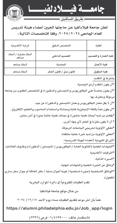 جامعة فيلادلفيا بحاجة لتعيين أعضاء هيئة تدريسية