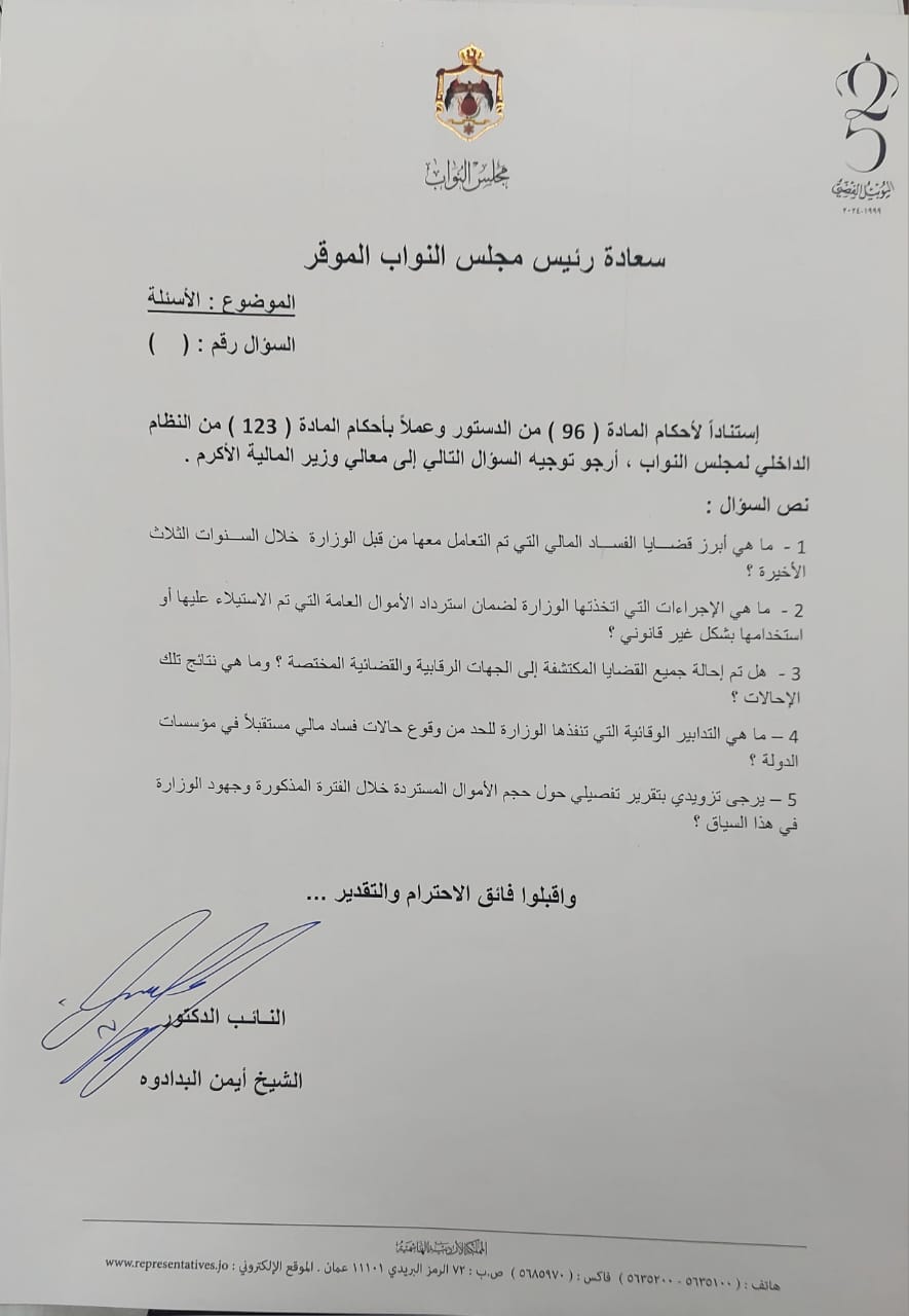 عمون - وجه النائب أيمن البدادوة عدة اسئلة لوزير المالية في إطار ممارسته لدوره الرقابي، تمثلت بالاستفسار عن قضايا الفساد وسبل مكافحتها وما إذا تم استرداد الأموال التي تم الإستيلاء عليها.