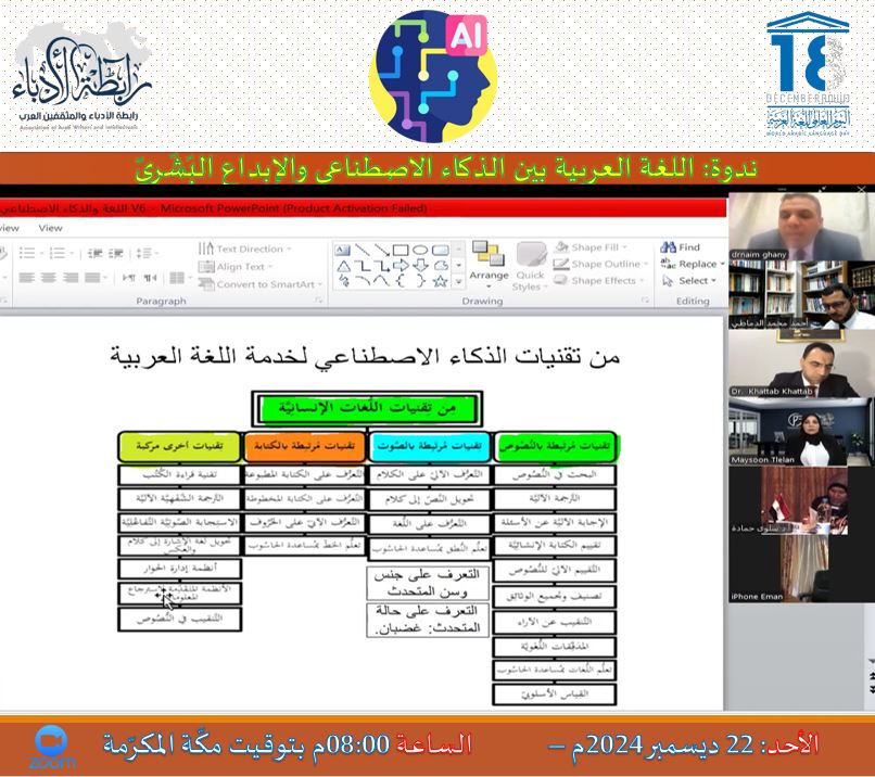 عمون - نظّمت رابطة الأدباء والمثقفين العرب، برعاية رئيسة الرابطة الدكتورة ميسون عيسى تليلان السليم، ندوة علمية تحت عنوان "اللغة العربية بين الذكاء الاصطناعي والإبداع البشري"، وذلك عبر منصّة "زووم" يوم الأحد الموافق 22 ديسمبر 2024، الساعة الثامنة مساءً بتوقيت مكة المكرمة، بمناسبة اليوم العالمي للغة العربية.