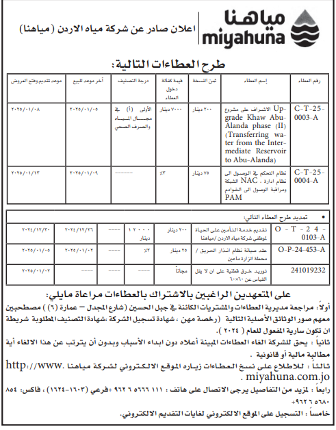 عطاءات صادرة عن شركة مياه الاردن "مياهنا"