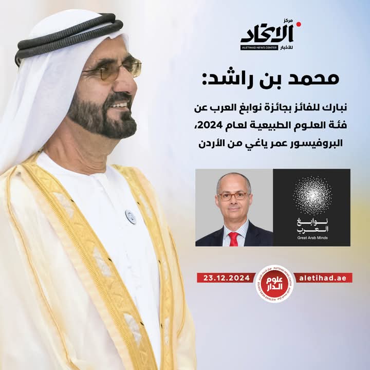 فلنصنع من هذا الحلم واقعًا يضيء دروب الأجيال القادمة، ولنجعل من إنجازات اليوم أساسًا لمستقبل أكثر إشراقًا. ولعلنا اليوم نحتفي بأحد هذه النماذج المشرقة، البروفيسور عمر ياغي من الأردن، الذي حصل على الجائزة في فئة العلوم الطبيعية، تقديرًا لإسهاماته المميزة.