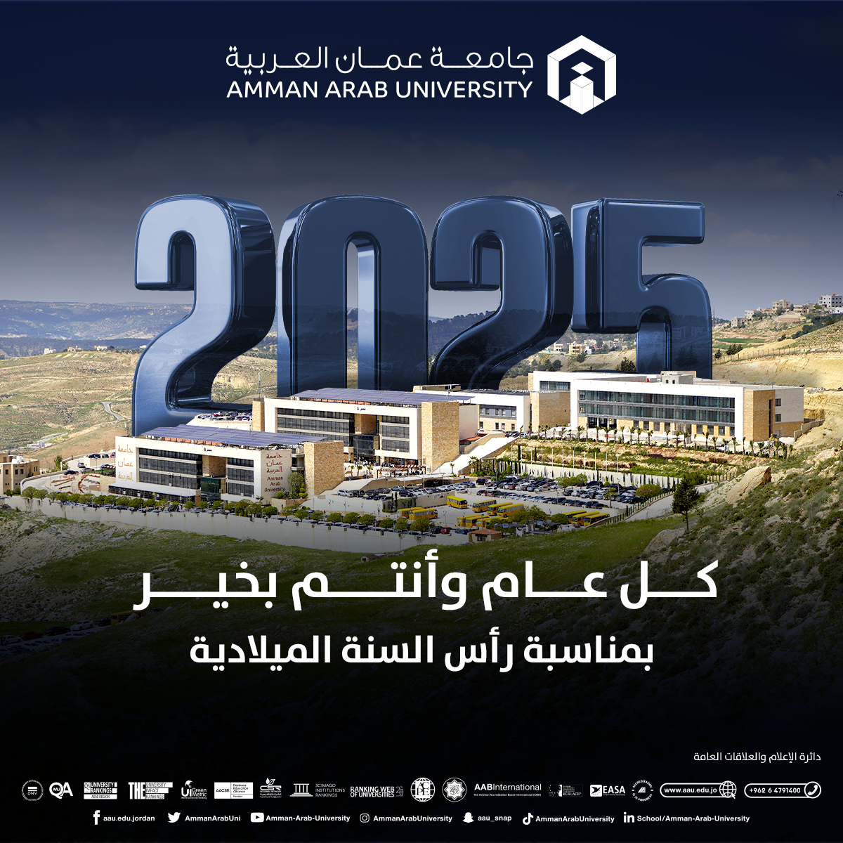 عمون - بمناسبة حلول رأس السنة الميلادية، تتقدم جامعة عمان العربية بأصدق التهاني وأطيب التمنيات لكم، متمنين لكم عاماً مليئاً بالنجاح والفرح والتقدم، ونسأل الله أن يكون هذا العام الجديد بداية لتحقيق المزيد من الإنجازات والتطور، وأن يديم عليكم الصحة والعافية والسعادة، كل عام وأنتم بخير، Happy New Year. |
