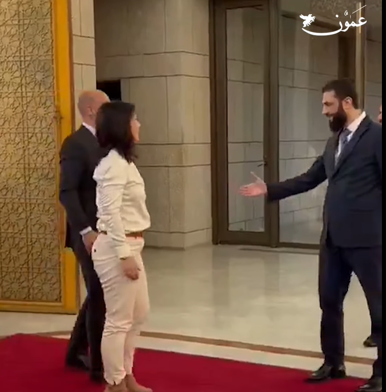 عمون - امتنع قائد الإدارة السياسية والعسكرية في سوريا، أحمد الشرع عن مصافحة وزير الخارجية الألمانية أنالينا بيربوك خلال استقباله لها في قصر الشعب في دمشق اليوم الجمعة. |