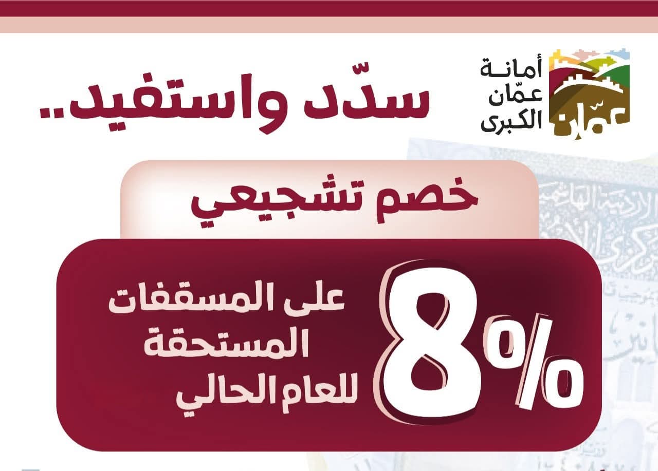 عمون - دعت أمانة عمان الكبرى، المواطنين، إلى الاستفادة من خصم 8% على ضريبة الأبنية والأراضي المستحقة (المسقفات فقط) عند تسديدها خلال شهري كانون الثاني وشباط من كل عام. |