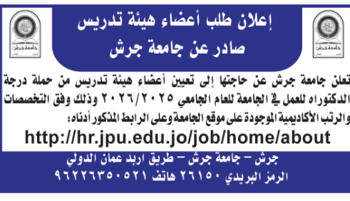جامعة جرش ترغب بتعيين أعضاء هيئة تدريسية