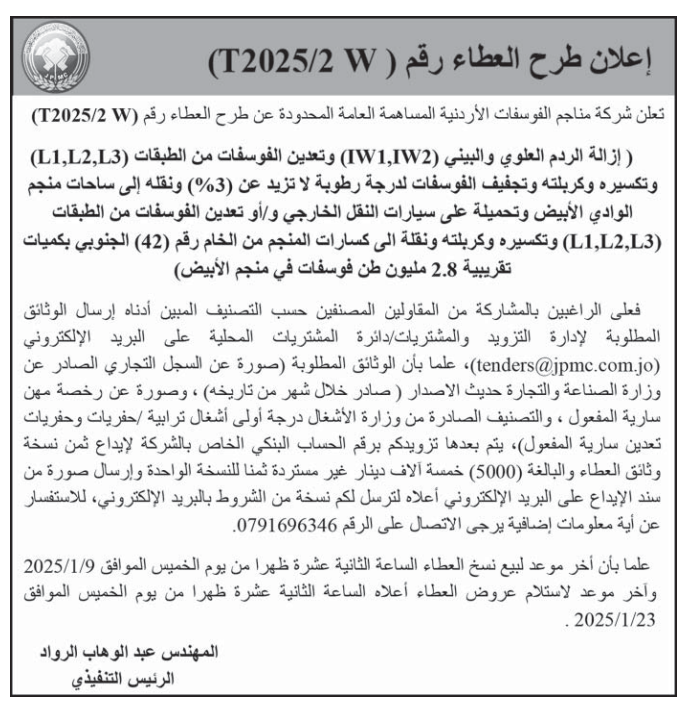 عطاء صادر عن شركة مناجم الفوسفات