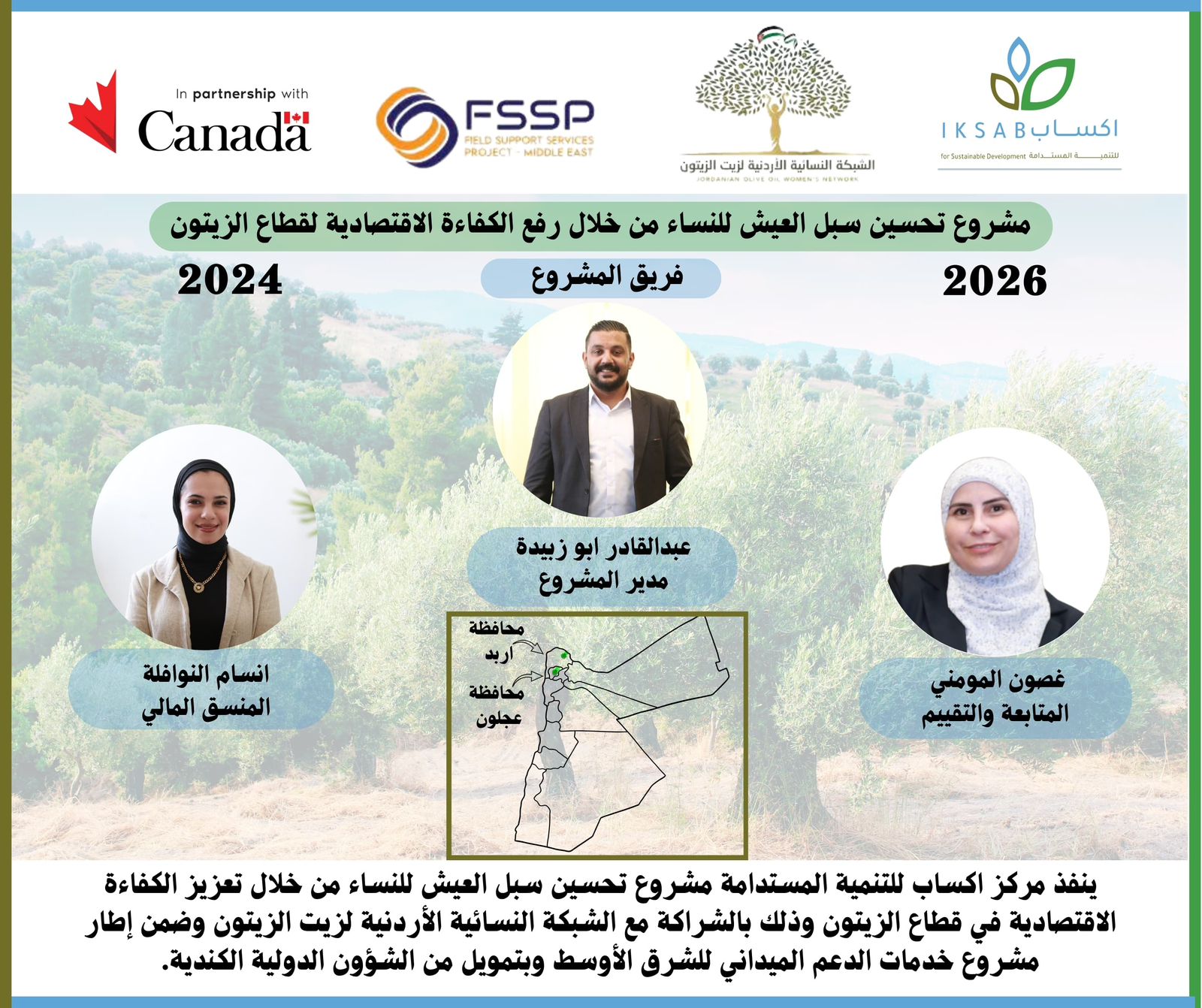 وجدير بالذكر أن مركز اكساب للتنمية المستدامة ينفذ مشروع تحسين سبل العيش للنساء من خلال رفع الكفاءة الاقتصادية في قطاع الزيتون وذلك بالشراكة مع الشبكة النسائية الأردنية لزيت الزيتون وضمن إطار مشروع خدمات الدعم الميداني للشرق الأوسط-كووتر انترناشونال وبتمويل من الشؤون الدولية الكندية.