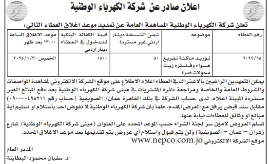 عطاء صادر عن شركة الكهرباء الوطنية