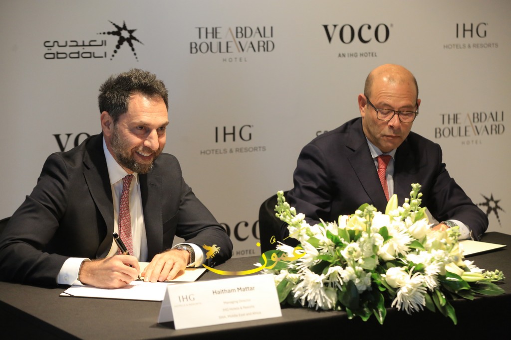 ووقع الاتفاقية كلّ من معالي عامر الفايز، رئيس مجلس إدارة شركة العبدلي للاستثمار والتطوير، وهيثم مطر، رئيس مجموعة فنادق ومنتجعات IHG في منطقة الهند والشرق الأوسط وأفريقيا بحضور حكومي رسمي تمثّل بمندوب معالي وزير الاستثمار مثنى الغرايبة؛ أمين عام الوزارة زاهر القطارنة، ومدير عام هيئة تنشيط السياحة الدكتور عبد الرزاق عربيات، إلى جانب ممثلين عن وسائل إعلام محلية.