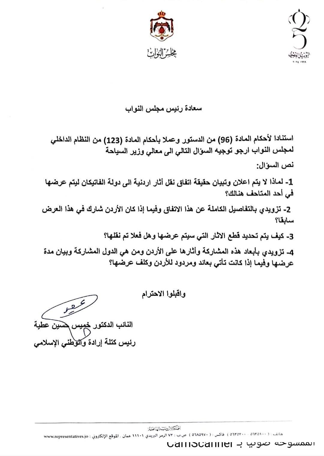 عمون - وجه النائب الدكتور خميس عطية، رئيس كتلة إرادة والوطني الإسلامي، سؤالا لوزيرة السياحة، عن نقل آثار أردنية لدولة الفاتيكان، وما هي أبعاد تلك الخطوة في المشاركة وكم مدتها.