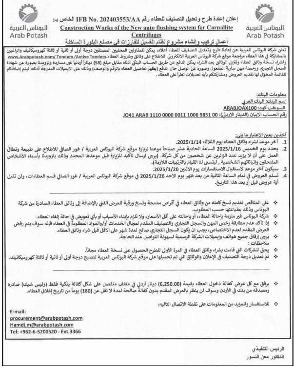 عطاء صادر عن شركة البوتاس العربية