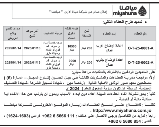 عطاءات صادرة عن شركة مياه الاردن "مياهنا"