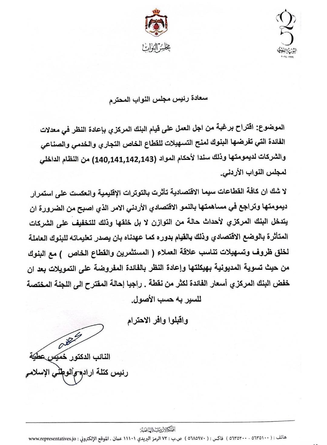 الموضوع: اقتراح برغبة من اجل العمل على قيام البنك المركزي بإعادة النظر في معدلات الفائدة التي تفرضها البنوك لمنح التسهيلات للقطاع الخاص التجاري والخدمي والصناعي والشركات لديمومتها وذلك سندا لأحكام المواد (140,141,142,143) من النظام الداخلي لمجلس النواب الأردني.