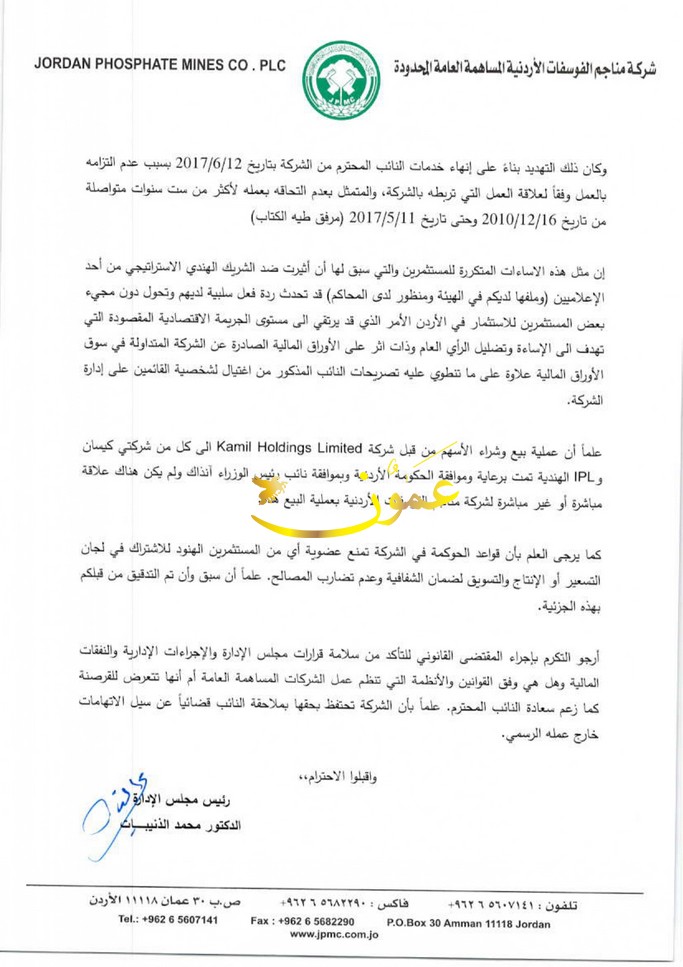 وحصلت عمون على نسخة من كتاب الرئيس التنفيذي لشركة مناجم الفوسفات، يتضمن قرار الاستغناء من منجم الشيدية لتغيبه عن العمل.