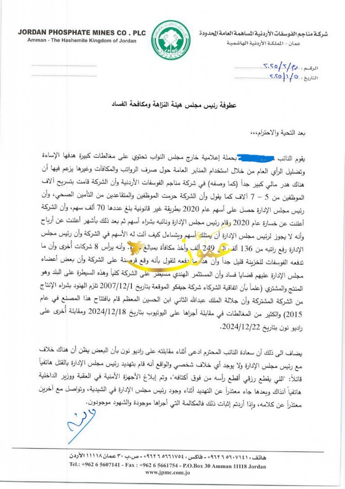 وحوّل الذنيبات نسخ من تفاصيل ما وصفه باغتيال الشخصية والحملة التي يشنها النائب إلى الحكومة والجهات المعنية وهيئة النزاهة ومكافحة الفساد لاتخاذ إجراء سليم.